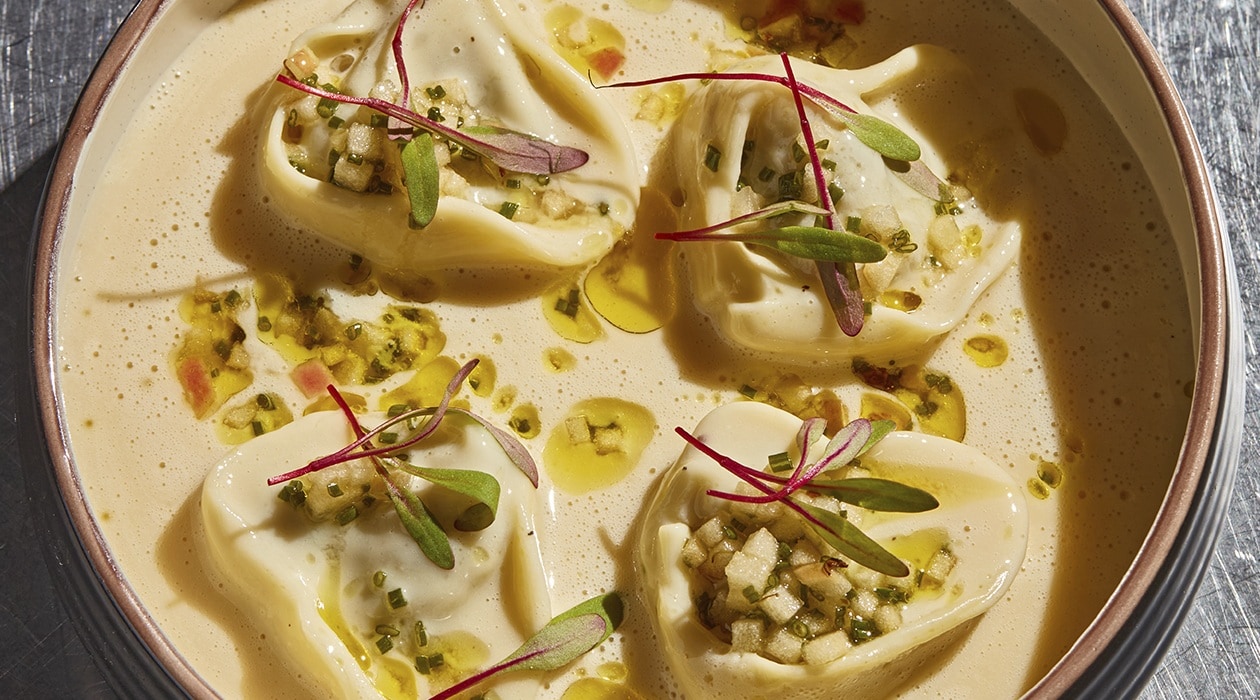 "Dumplings" con Champiñones y Sopa de Ajo Negro